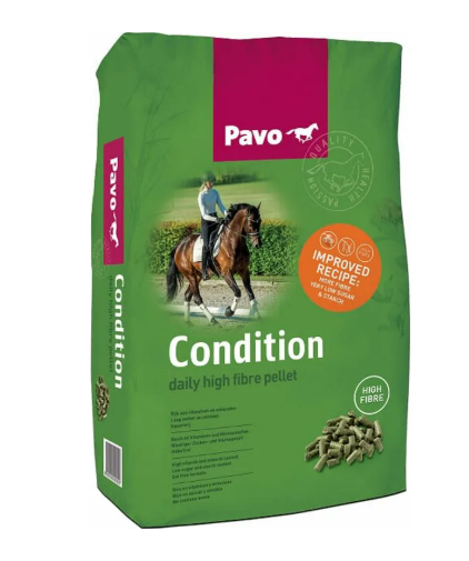 Pavo Condition er den ideelle høj-fibre pellet til heste og ponyer i let til moderat arbejde. Pavo Condition er fuld balanceret med vitaminer og mineraler. Den er naturligt og nøje sammensat efter den nyeste viden og ved at give Pavo Condition sikre du at hesten får alle de næringsstoffer, som der behøves til let arbejde, påbegyndt træning og moderat arbejde. Pavo Condition møder alle de daglige krav til vitaminer og mineraler, har et højt indhold af let fordøjelige fibre og et lavt indhold af sukker og stivelse, hvilket resulterer i et excellent, non-heating foder til heste og ponyer i let arebjde til dem der konkurrerer på et alm. niveau. Pavo Condition er havrefri, hvilket gør den velegnet til heste der bliver for “varme” af havre.