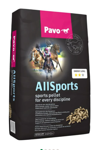 Med Pavo AllSports giver du den komplette daglige støtte til sportsheste, som skal yde en middel til hård sportspræstation. Pavo AllSports er et fuldgyldigt kraftfoder og indeholder den ideelle energikilde til heste: en kombination af stivelse (korn) til den hurtige energi og ‘power’, og fiber og olier til udholdenhed. Den høje andel af fiber og olier sørger for, at din hest er mere udholden og kan arbejde længere uden at blive for ‘tændt’ af det. Kornet i Pavo AllSports har været igennem en speciel varmebehandling, hvorved din hest kan optage og bruge det normalt ufordøjelige korn.